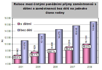■V roce 2008 se zvýšila relace mezi čistými peněžními příjmy zaměstnanců s dětmi a zaměstnanců bez dětí na jednoho člena rodiny na 60,2 % proti roku 2007, kdy dosáhla 59,2 %. Čisté peněžní příjmy zaměstnanců s dětmi rostly rychleji, než zaměstnanců bez dětí.