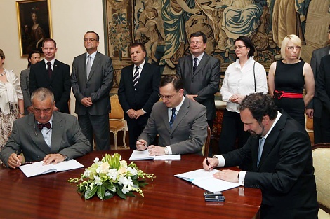 Předsedové Občanské demokratické strany, TOP 09 a Věcí veřejných Petr Nečas, Karel Schwarzenberg a Radek John podepsali v Hrzánském paláci koaliční smlouvu "vlády rozpočtové odpovědnosti". Zavázali se k boji s dluhy a s korupcí.